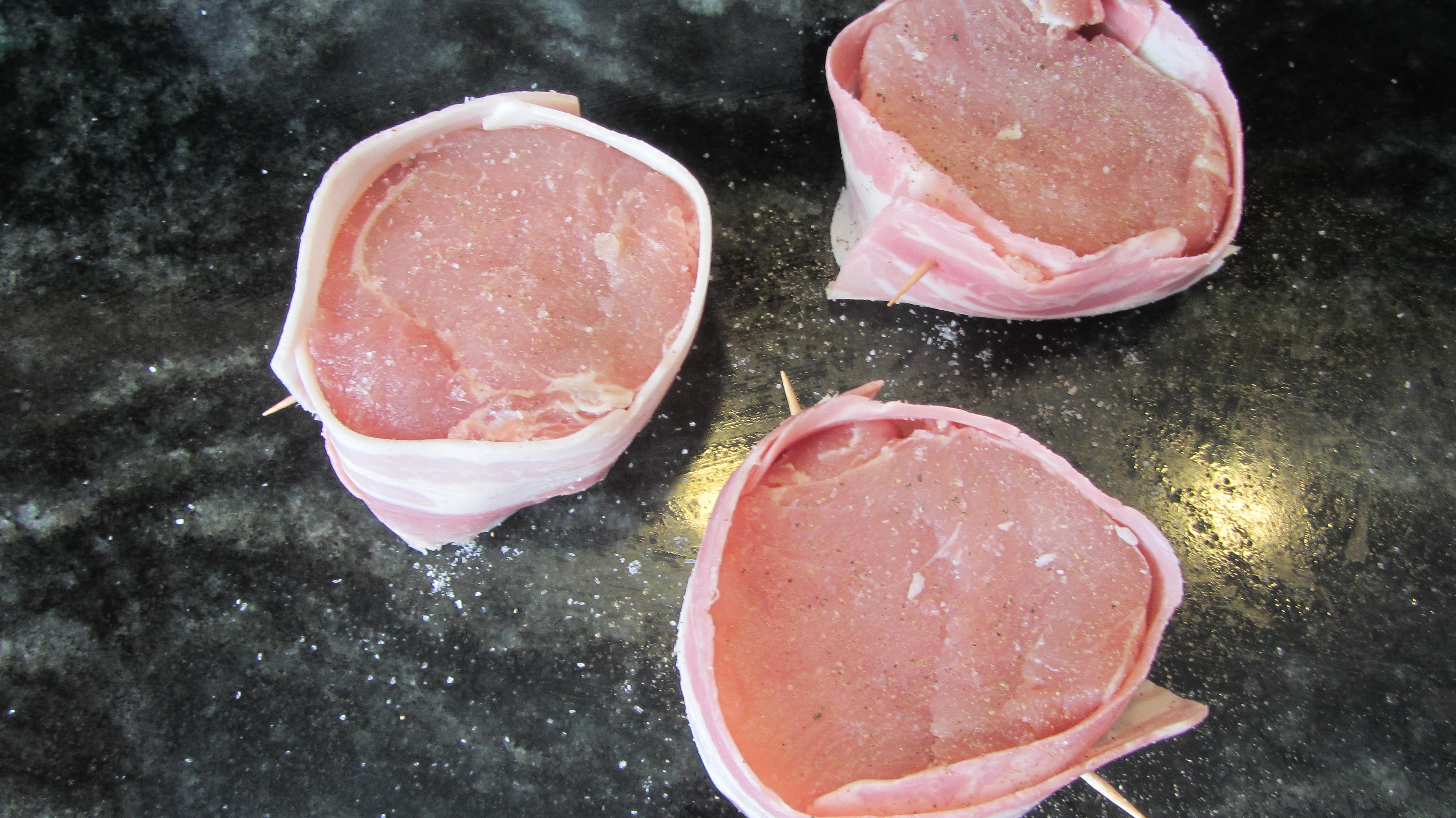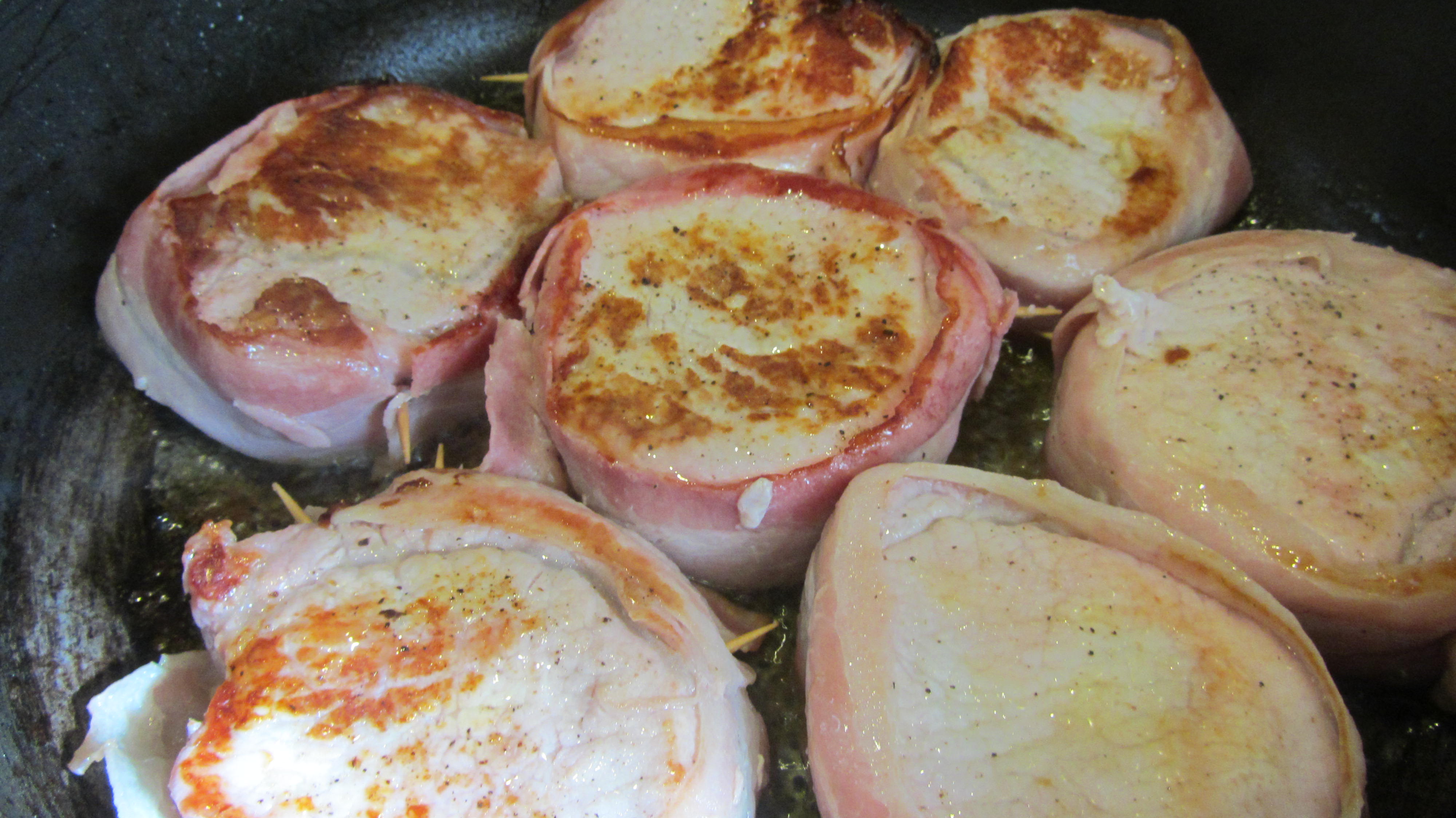 Primero vamos con la carne, la preparamos sobre la tabla, cortando un lomo de cerdo en discos de 3 cm y los salamos y pimentamos por ambas caras, cogemos las tiras de bacon y rodeamos con ellos los discos y los cerramos pinchando unos palillos para que no se nos suelten en la sartén (no dejéis asomar mucho los palillos porque luego molestan al freír)