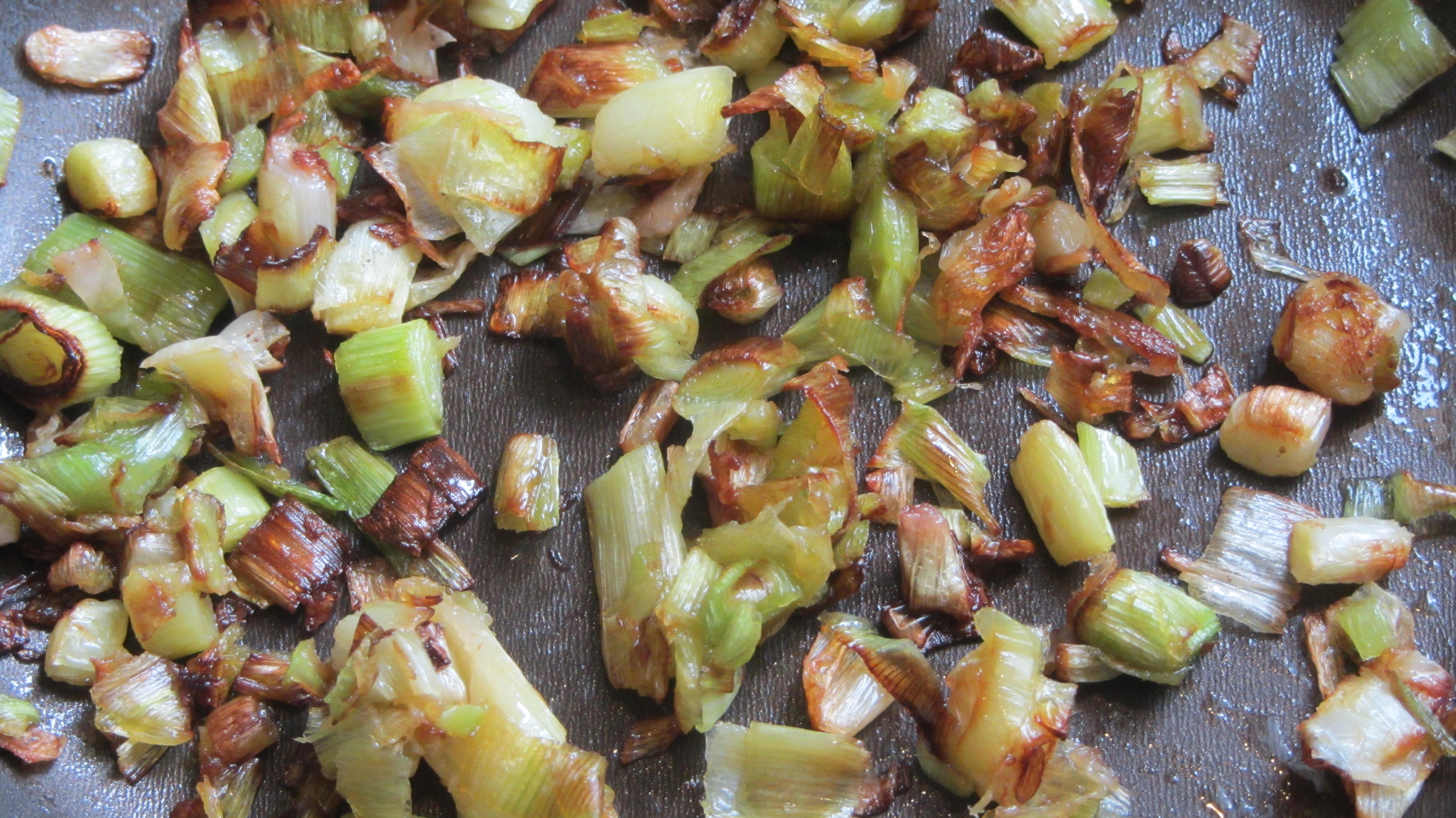 • Salteamos unos ajetes cortados finos y los echamos por encima al emplatar
